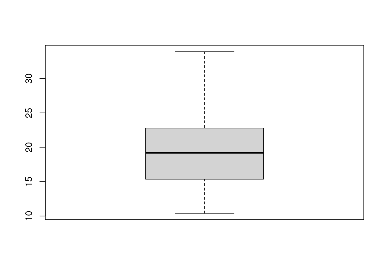 The Interquartile Range (IQR) is the distance between the first quartile (\(Q1\), 25th percentile) and third quartile (\(Q3\), 75th percentile), capturing the middle 50% of the data. Both \(Q1\) and \(Q3\) are special percentiles. A percentile is a value below which a certain percentage of observations in a group of observations falls. For example, the 25th percentile (i.e., \(Q1\)) is the value below which 25% of the data falls, the 75th percentile (i.e., \(Q3\)) is the value below which 75% of the data falls, and the median is the 50th percentile. Percentiles of data can be found using R software (Section 1.3).